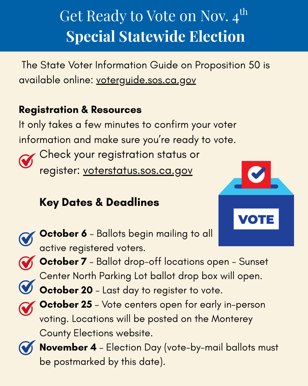 • Every Thursday – Carmel's Farmers Market 10am-2pm - Devendorf Park • Every 2nd Saturday – Weedies in Mission Trail Nature Preserve HERE 9:30-noon • Every 2nd Saturday – Carmel’s Art Walk HERE 4-7PM • Every 1st & 3nd Monday - Carmel Woman's Club Programs & Tea - 2-4PM HERE