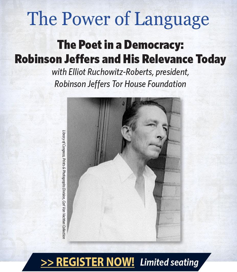 Oct 8, Wednesday - CPLF - Poet in a Democracy - Robinson Jeffers at Carpenter Hall 7-8PM Register HERE